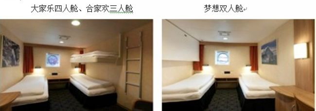 (4)哥本哈根-奥斯陆豪华游轮北欧王冠号海景双人舱,斯德哥尔摩-赫尔辛基豪华游轮诗丽雅海景双人舱。