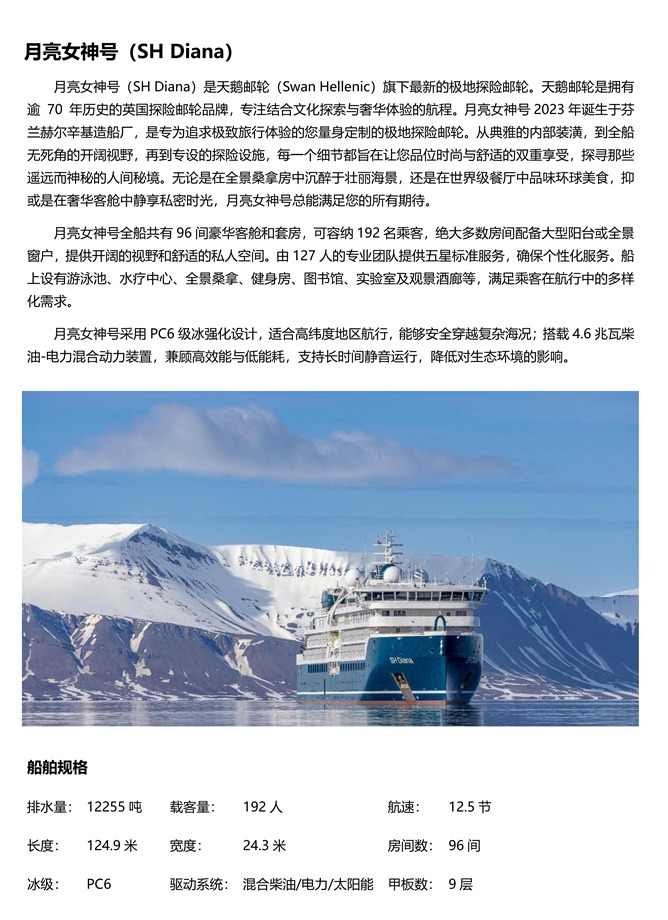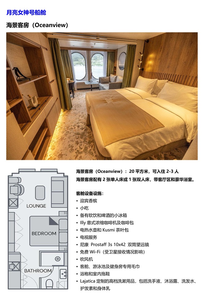 √ 五星新船。月亮女神号是 2023 年首航的小型奢华极地邮轮,设施先进豪华,探险队经验丰富,舒适性与体验感无与伦比。