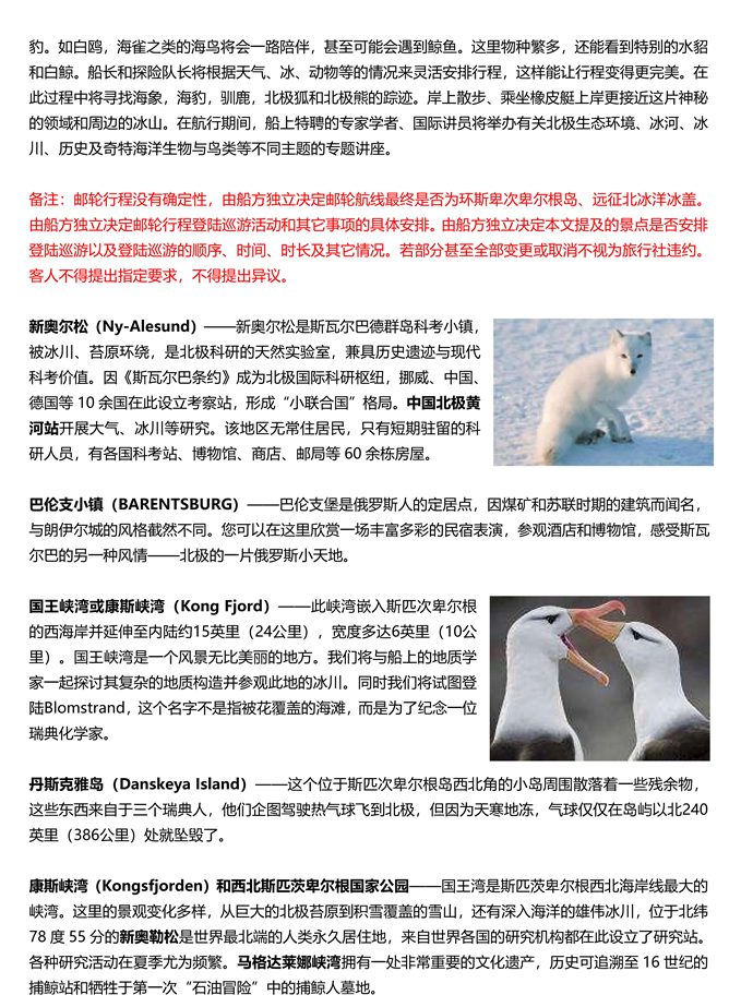 √ 极品行程。乘坐邮轮环岛登陆巡游北极熊最多的地区“北极熊王国”、“北极野生动物天堂”—— 斯瓦尔巴群岛,往北深入北冰洋冰盖约北纬 81 度左右,与北极熊共度清凉暑假。在“冰与火国度”——冰岛环岛观赏近似月球表面的火山地貌,身临烟雾缭绕如梦似幻的温泉湖泊。
