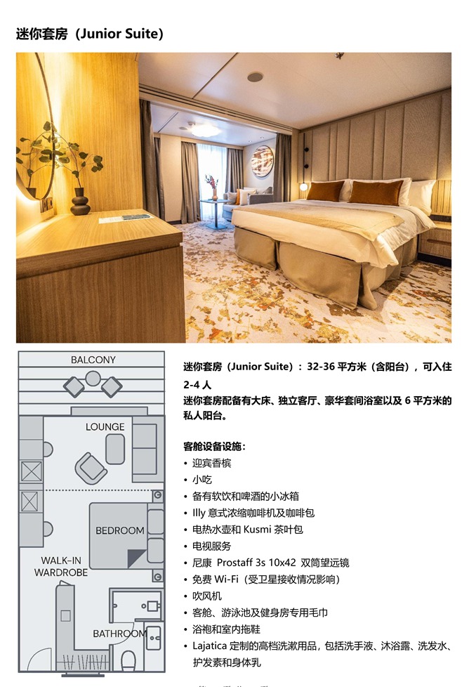 迷你套房 Junior Suite 五楼、六楼 32-36 ㎡(含阳台 6 ㎡) 158800元/人 早鸟优惠价: 153800元/人