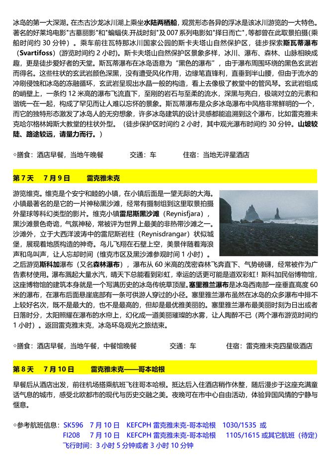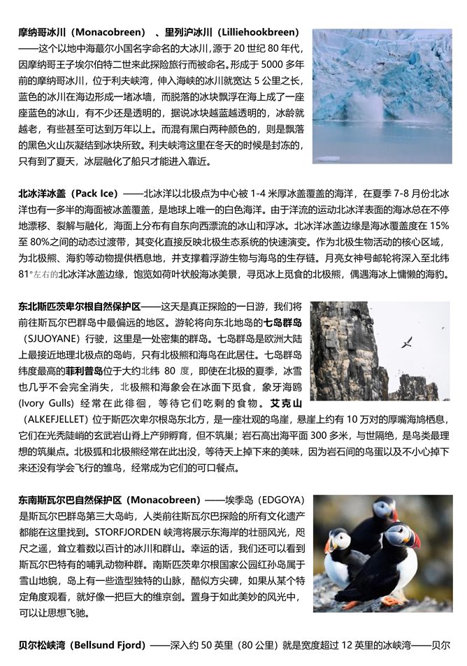 √ 极品行程。乘坐邮轮环岛登陆巡游北极熊最多的地区“北极熊王国”、“北极野生动物天堂”—— 斯瓦尔巴群岛,往北深入北冰洋冰盖约北纬 81 度左右,与北极熊共度清凉暑假。在“冰与火国度”——冰岛环岛观赏近似月球表面的火山地貌,身临烟雾缭绕如梦似幻的温泉湖泊。
